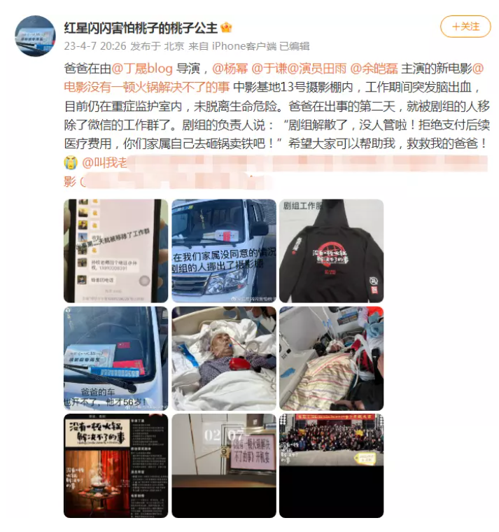 近日,由楊冪、于謙、田雨等主演的懸疑喜劇電影《沒有一頓火鍋解決不了的事情》(以下簡稱《火鍋》)劇組內(nèi)發(fā)生了一則工作人員突發(fā)腦溢血的新聞。經(jīng)了解,該工作人員是《火鍋》劇組內(nèi)的司機。起初,一位網(wǎng)友求助各大媒體,稱自己爸爸在參加《火鍋》電影拍攝工作期間突發(fā)腦出血,住進重癥監(jiān)護室,至今沒有脫離生命危險,并曬出父親住院,曾在工作室聊天群,以及穿著劇組服裝的照片,和駕駛車輛的信息照片。